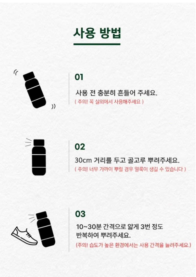 사용 시 주의할 점은 스프레이를 30cm 정도 떨어진 거리에서 고르게 분사하고, 10~30분 간격으로 3번 반복하는 것이 좋습니다.