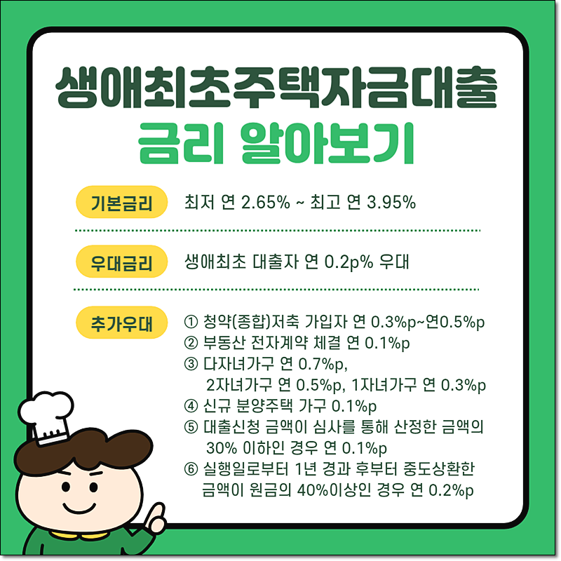 대출 금리는 대출 상품에 따라 다르지만, 일반적으로 2.45%에서 3.95% 사이입니다. 특히, 생애최초주택자금대출의 경우 특별 금리 혜택이 있어, 첫 대출자에게는 0.2%의 추가 할인 혜택이 제공됩니다. 이 외에도 다양한 조건에 따라 금리가 달라질 수 있으니, 자세한 사항은 금융기관에 문의하는 것이 좋습니다.