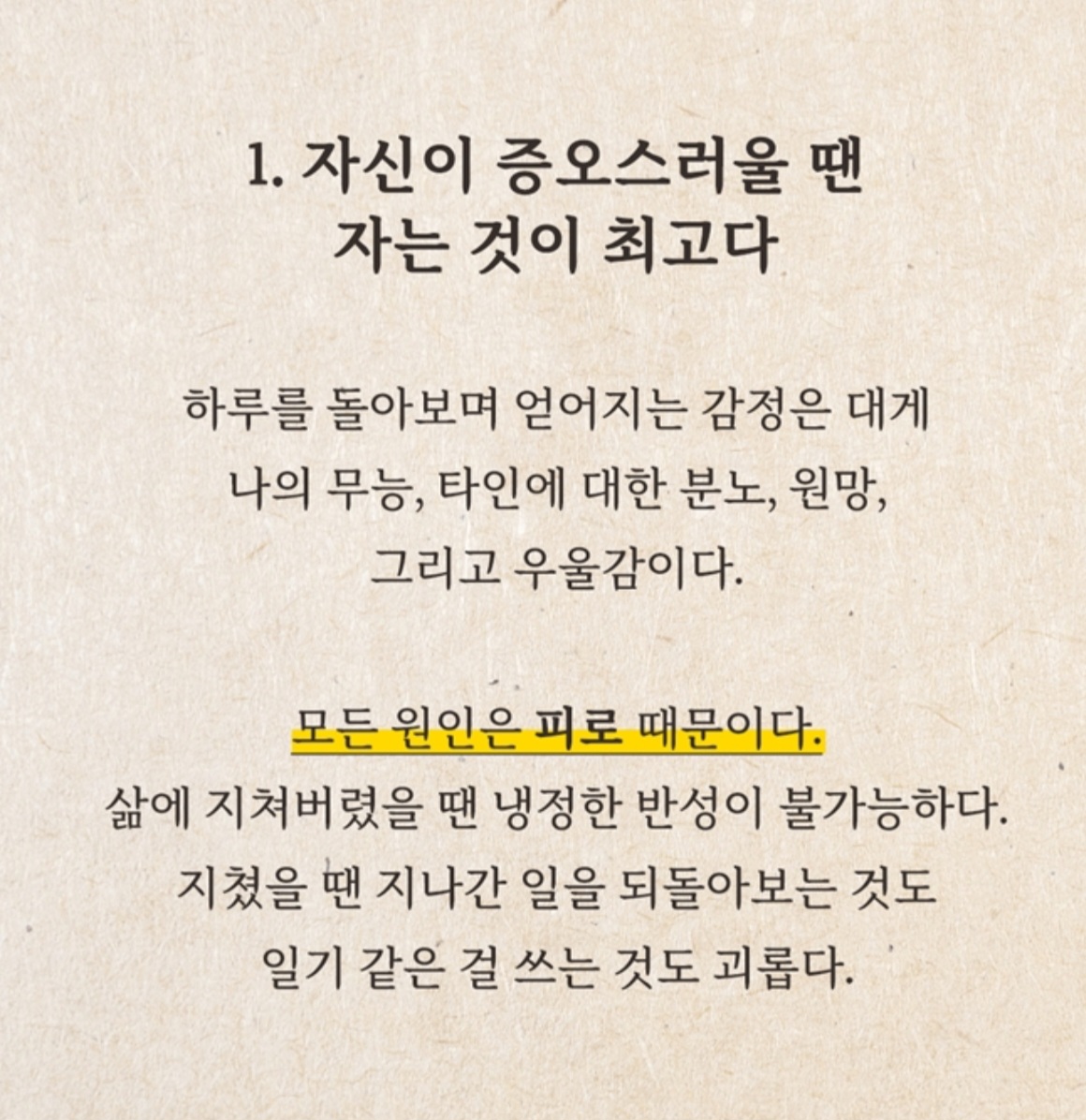 또한 "모든 원인은 피로 때문이다"라는 문장은 현대 사회에서의 스트레스와 피로를 잘 표현하고 있습니다.