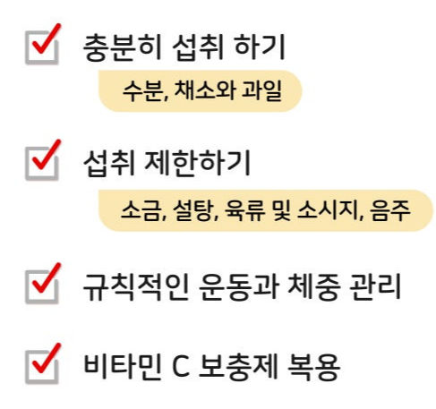 채소와 과일을 많이 섭취하고, 고지방 및 고칼로리 음식을 피해야 합니다.