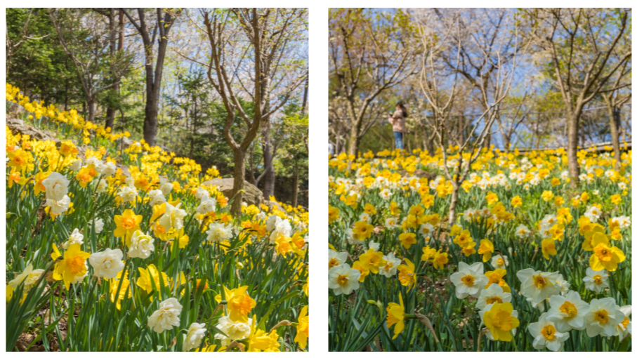 사진에서 보이는 것처럼, 노란 수선화가 바다처럼 펼쳐진 모습을 보면 그야말로 환상적이에요.