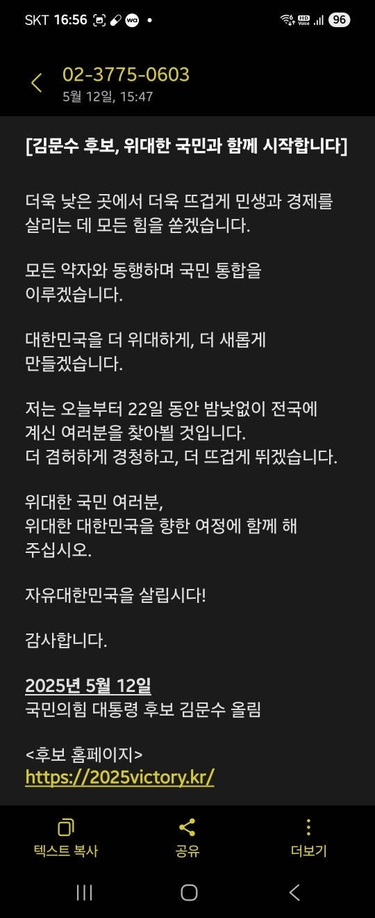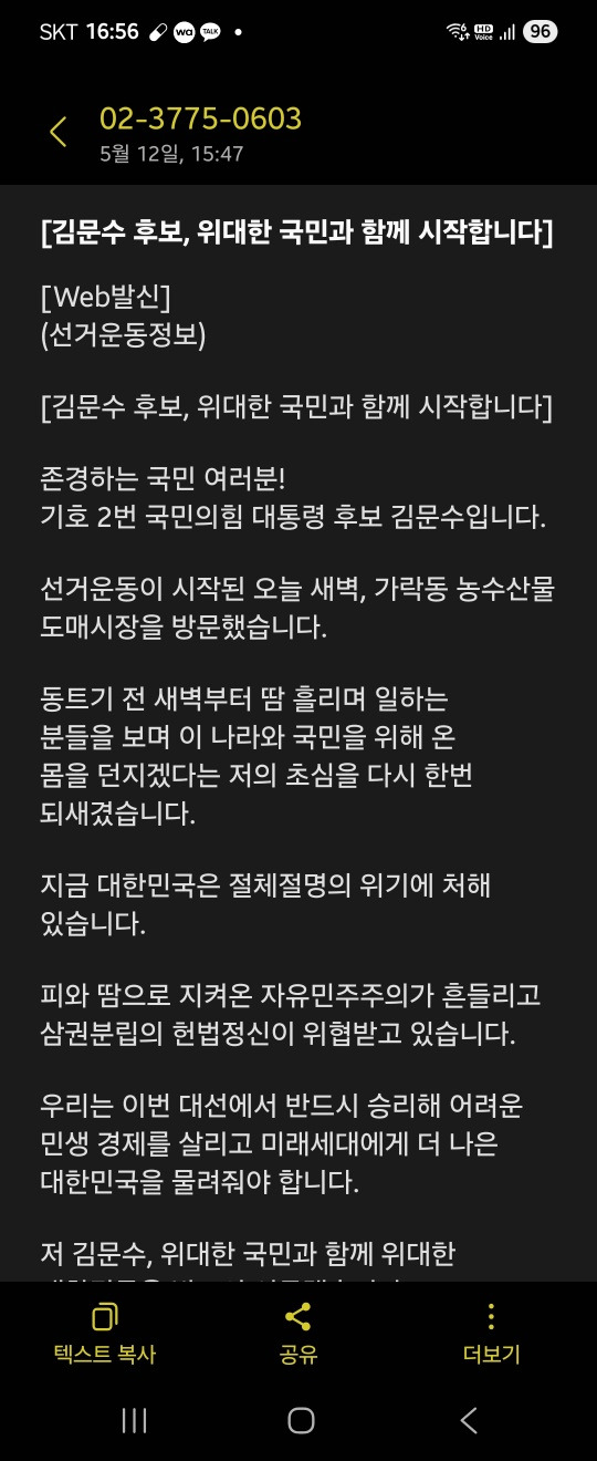 오늘 저는 김문수라는 대선 후보 명의로 발송된 문자 메시지를 받았습니다.
