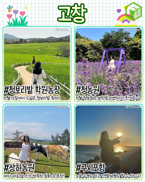 특히 청보리밭과 유채꽃이 만발한 고창의 풍경은 인생 사진 찍기 좋은 장소입니다.