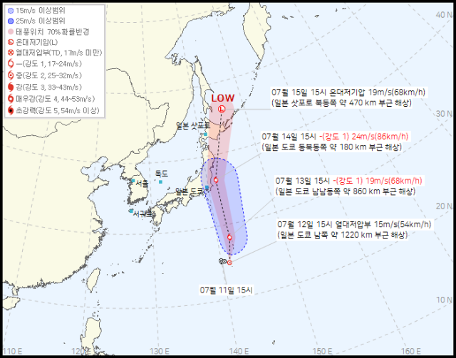 기상청의 예보에 따르면, 나리는 7월 14일경 제주도에 가장 근접할 것으로 예상됩니다.