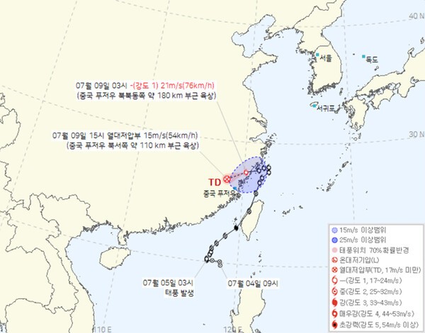 이 지도는 동중국해에서 발생한 열대 저기압의 경로를 보여주고 있으며, 한국에 미치는 영향을 예측하는 데 도움이 됩니다.